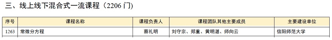近日,教育部正式公布了第三批国家级一流本科课程认定结果公示名单,信阳师范大学威尼斯9499登录入口蔡礼明教授作为负责人的《常微分方程》课程入选“线上线下混合式一流课程”。