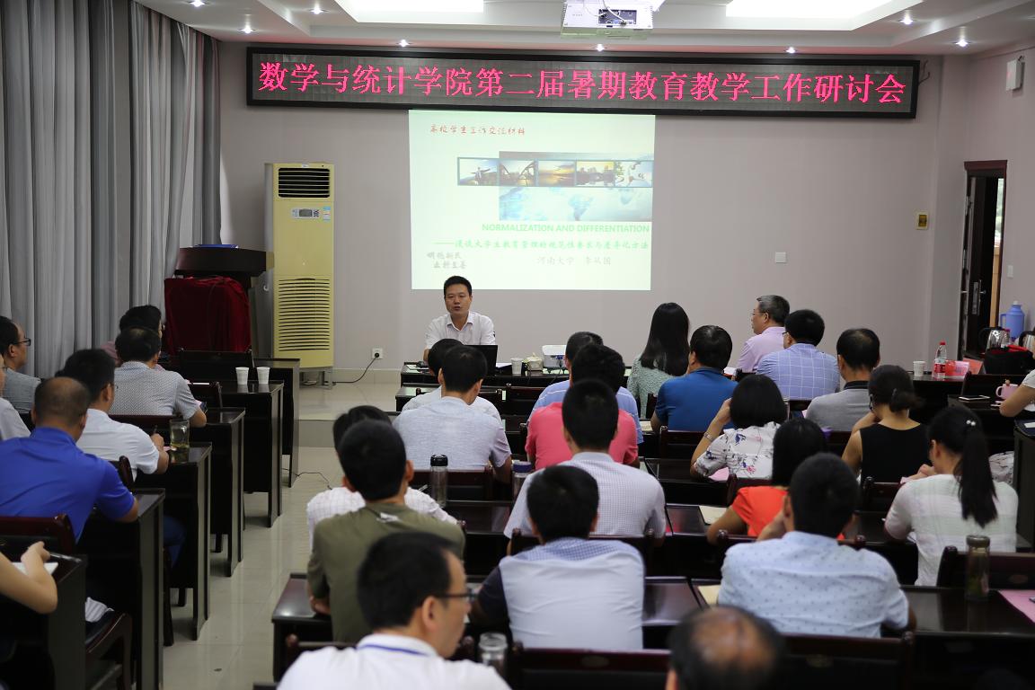 上午,河南大学国际教育学院党委副书记李从国副教授做了题为“大学生教育管理的规范性与差异化初探”的报告。他结合自己二十余年从事学生工作的经验和体会,以大量的实践案例就如何了解学生工作对象、如何根据学生的整体性特征和差异化来开展学生工作以及如何引导学生等方面,作了一场内涵丰富、具有很强针对性和指导意义的报告,对数学与统计学院的学生管理工作具有重要的指导意义。数学研究所副所长周学勇、数学与统计学院党委副书记洪亮分别就2016-2017学年本科教学工作、学生工作作了汇报,总结了教学、学生工作的成绩,还明确了需要努力的方向和新学期的工作重点。