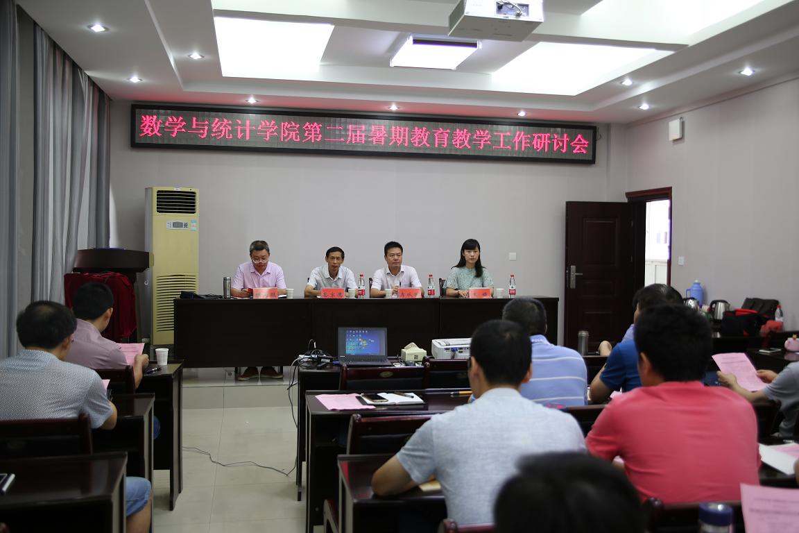 8月26日,数学与统计学院在数学楼会议室召开第二届暑期教育教学工作研讨会。河南大学国际教育学院党委副书记李从国副教授、信阳师范学院学生处处长岳宗德副教授、数学与统计学院全体教师参加了本次研讨会。会议由数学与统计学院院长胡余旺教授主持。