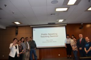 本次活动的工作语言是英文。聂薇老师、程熙旭老师、美籍教师Sheldon Gosline分别就“演讲辩论课的课程建设与教师协作共同体建设”、“学会演示技巧有绝招!”和“将交际技巧引入演讲课,开口不是事儿!”进行专题发言。三位老师的发言各有特色:聂薇老师严谨系统;程熙旭老师干练清晰,Sheldon Gosline老师幽默风趣。