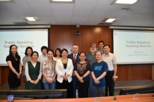 随后,蔡鸿老师做了总结发言。他感谢演讲组老师们在百忙中专门抽出时间进行教学研讨活动,每位发言者准备充分,内容精彩,给大家呈现了一堂精彩的演讲课堂。蔡老师表扬了演讲组在最近几年花大力气,在教学科研上取得了一系列的好成绩,特别是在指导学校演讲辩论队所取得的国内、外优异成绩。蔡老师鼓励演讲组老师以此活动为契机,加快演讲课课程建设和教学研究,在目前已取得的教学和科研成果的基础上,再上一层楼。最后,研讨会在中外老师们热烈的掌声中圆满结束。
