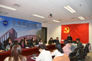 2017年12月20日中午,pp电子游戏平台网站直属党支部于西校区综合楼1016室召开预备党员转正大会,讨论关于2017级MTI硕士生段雅雯同志、杨帆同志和韩静伟同志申请转为正式党员的问题。出席本次大会的同志有学院直属党支部书记李莉文同志、副书记蔡鸿同志、党支部其他委员,以及党支部其他教师和学生党员共29人。本次大会由程熙旭老师和仵胜奇老师主持。本次出席会议的有表决权的党员有26人,其中学生10人,教师党员16人,超过本支部有表决权党员半数,符合人数规定。转正大会共分四项议程。