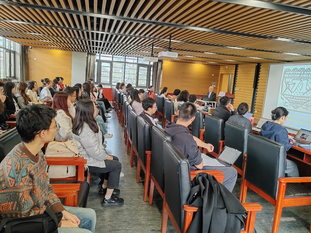 本·查佩尔教授首先从美国和墨西哥两国关系的历史讲起,阐述了美国墨西哥裔的民族特征和文化传统,及其对美国社会发展所作的贡献。他表示,19世纪40年代,美国发动美墨战争,吞并了原属于墨西哥的德克萨斯、新墨西哥、加利福尼亚等地,这些地方的墨西哥人随即成为墨西哥裔美国人。作为美国社会的少数族裔,他们在争取平等权利的过程中逐渐形成了自己鲜明的民族特征和文化传统。他们的“趴地跳跳车”和“快速垒球”运动不仅是鲜明的民族文化标志,也是美国社会一道亮丽的风景线。在讲座中,查佩尔教授还从美国民主党人和共和党人对待移民的态度等方面阐述了美国研究中种族、移民及身份认同的重要性,驳斥了“美国拉美化”的错误论调,强调了墨西哥裔美国人对美国社会发展的重要贡献。在讲座的问答环节,查佩尔同在场的师生进行了热烈的交流和讨论。