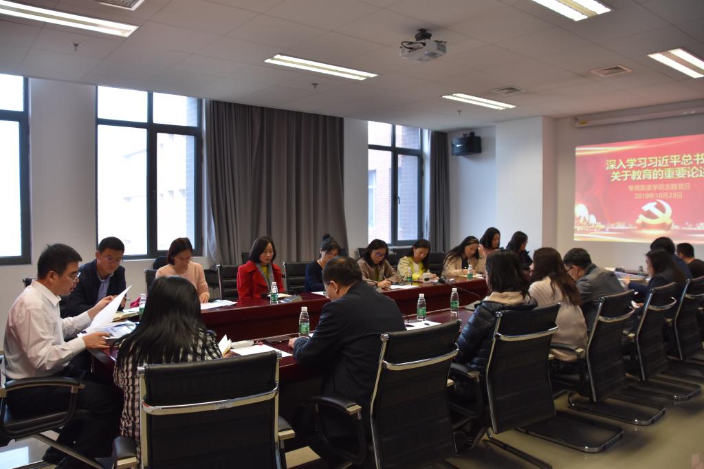 为深入贯彻落实学校“不忘初心、牢记使命”主题教育活动要求,pp电子游戏平台网站直属党支部10月23日下午1:20在国际大厦1016会议室举行主题党日活动,召开“深入学习习近平总书记关于教育的重要论述”学习交流会。学校主题教育第三督导组督导、离退休党总支副书记刘刚、学院“双带头人”教师党支部书记工作室负责人李莉文、直属支部书记仵胜奇、副书记蔡鸿、支部委员蒋岳春、匡琳琳 以及全体党员19人参加。交流会由蔡鸿主持。