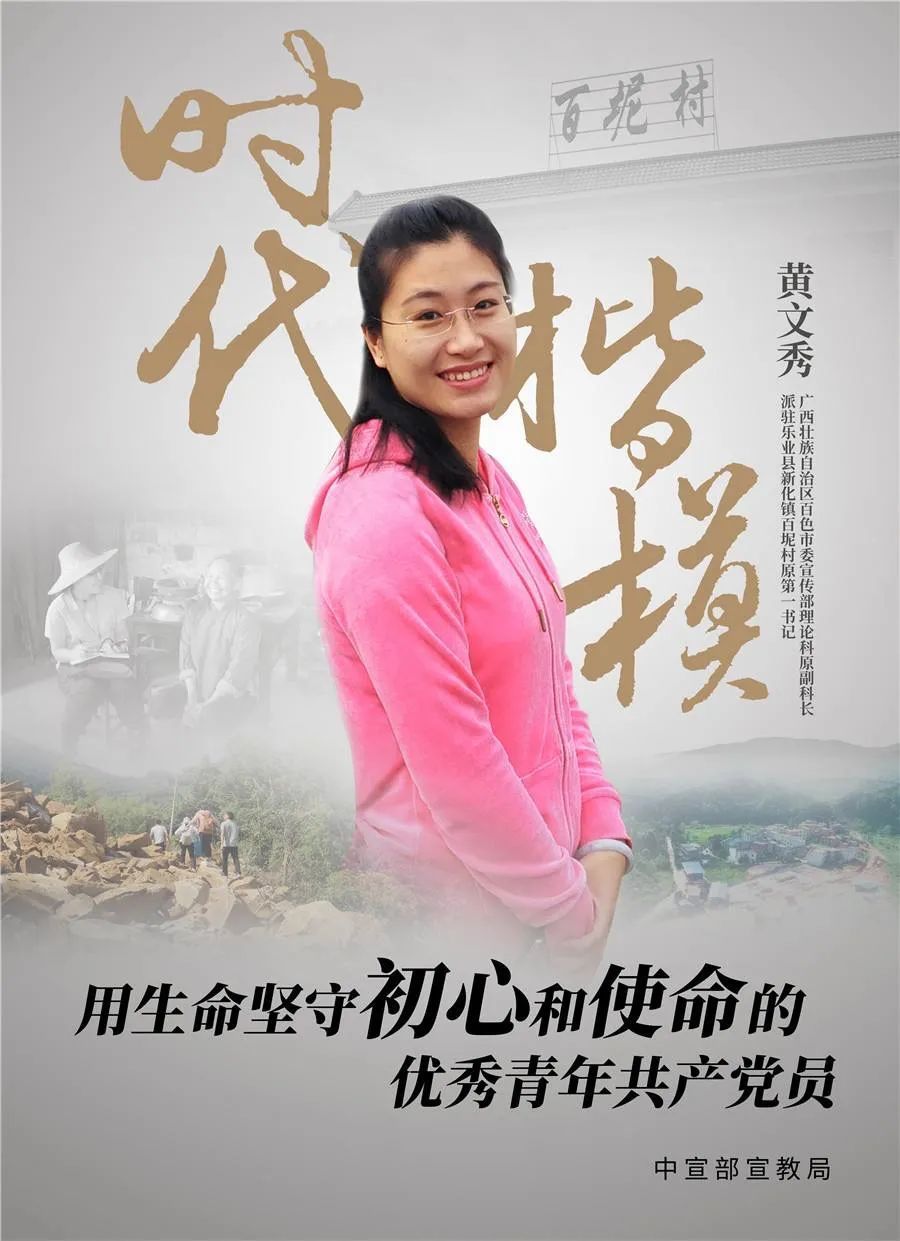 黄文秀(1989—2019),女,壮族,广西田阳人,中共党员。生前系广西壮族自治区百色市委宣传部理论科副科长、百色市乐业县新化镇百坭村党支部第一书记。2016年7月北京师范大学法学硕士毕业,作为定向选调生,被分配到百色市委宣传部工作。2017年9月至2018年3月,挂任百色市田阳县那满镇党委副书记;2018年3月起担任百色市乐业县新化镇百坭村党支部第一书记。2019年6月16日黄文秀同志利用周末回田阳县看望父亲后,因心系所驻村群众防汛抗洪工作,冒着暴雨连夜开车返回工作岗位,途中遭遇山洪暴发不幸牺牲,年仅30岁。黄文秀同志先后被追授“全国三八红旗手”“全国脱贫攻坚模范”“时代楷模”“最美奋斗者”“全国优秀共产党员”等荣誉称号。